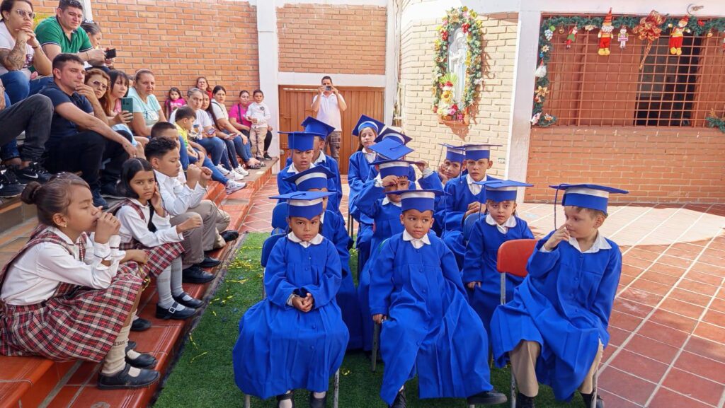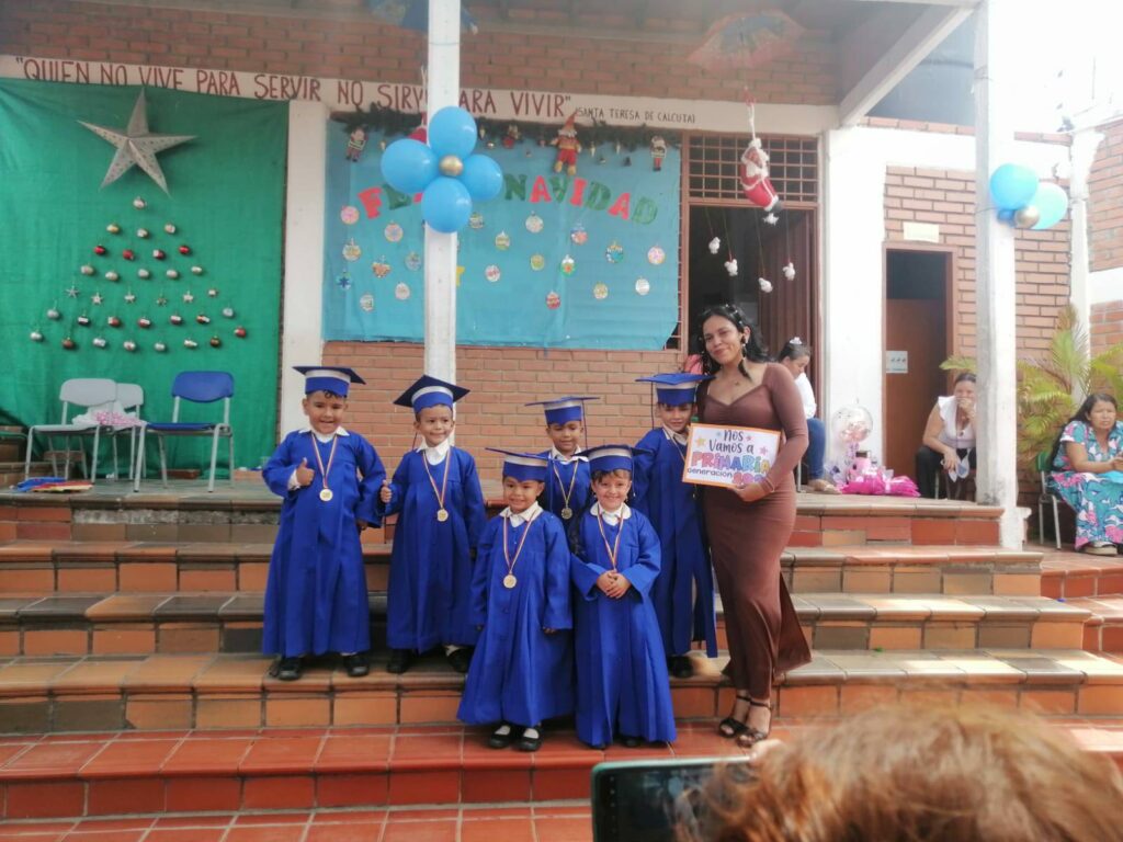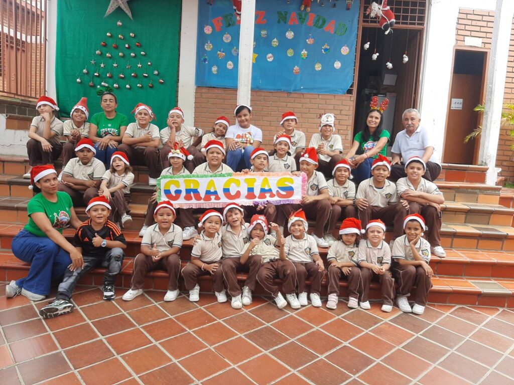 Ons plan om in april 2025, met z’n drietjes, een bezoek aan de school te brengen kon vanwege de onveilige situatie in Colombia niet doorgaan. Het zou de eerste kennismaking met de school hebben moeten worden voor Catri en Ilse. Het is wachten op een positief reisadvies van de overheid. Afgelopen jaar waren wij als bestuur, naast alle donaties uwerzijds, zeer actief met de werving van financiën. Naast eigen bijdragen verdienden wij geld door onder andere de verkoop van 2e hands spullen, met klussen en door sponsering bij het lopen van een marathon. Gezien de goede financiële resultaten van 2025 kunnen we in februari 2026 weer een donatie aan de school doen. Het schooljaar 2025 verliep, ondanks de onrust in de regio, rustig. Halloween en kerst werden gevierd en eind november namen een aantal kinderen, feestelijk gekleed, afscheid van de kleuter- en basisschoolperiode, ook wel graduación (afstuderen) genoemd. Tot slot ontvingen alle kinderen weer een door ons gesponsord kerstcadeautje. De kinderen bedanken u voor uw steun.